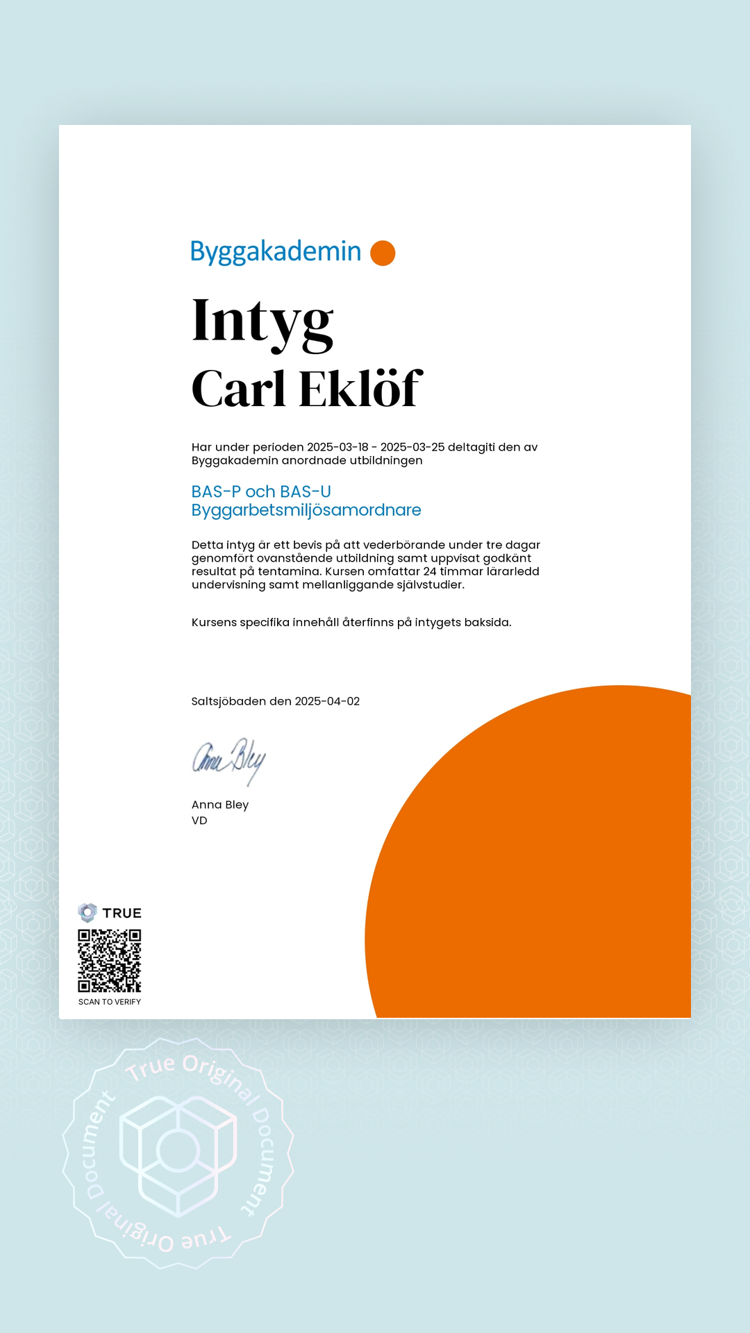 Alla TRUE -document är säkrade med blockchain-teknologi och kan verifieras som äkta. Klicka på verifieringsknappen bredvid dokumentet eller skanna QR-koden med din smartphones kamera. Ingen app krävs - dokumentets äkthet verifieras omedelbart.
