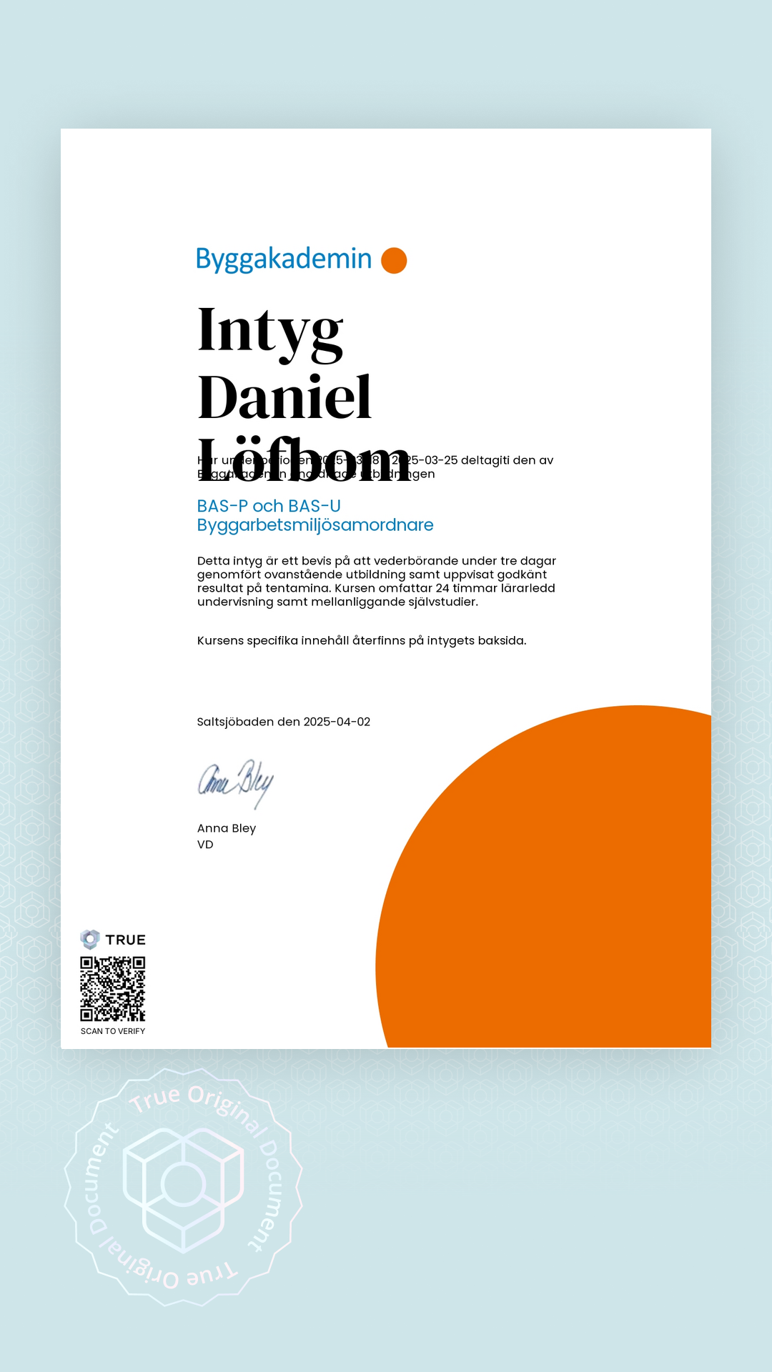 Alla TRUE -document är säkrade med blockchain-teknologi och kan verifieras som äkta. Klicka på verifieringsknappen bredvid dokumentet eller skanna QR-koden med din smartphones kamera. Ingen app krävs - dokumentets äkthet verifieras omedelbart.