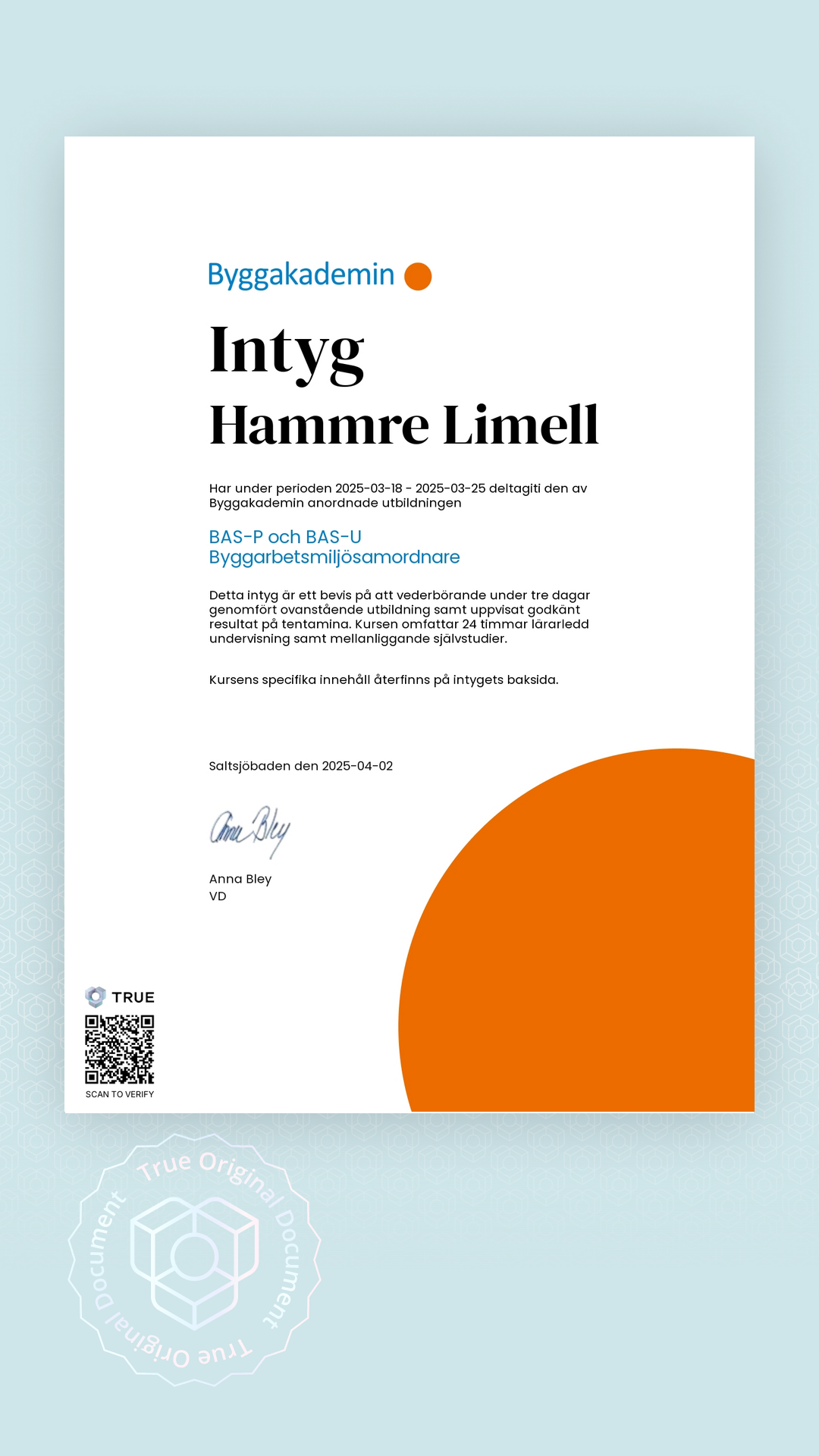 Alla TRUE -document är säkrade med blockchain-teknologi och kan verifieras som äkta. Klicka på verifieringsknappen bredvid dokumentet eller skanna QR-koden med din smartphones kamera. Ingen app krävs - dokumentets äkthet verifieras omedelbart.