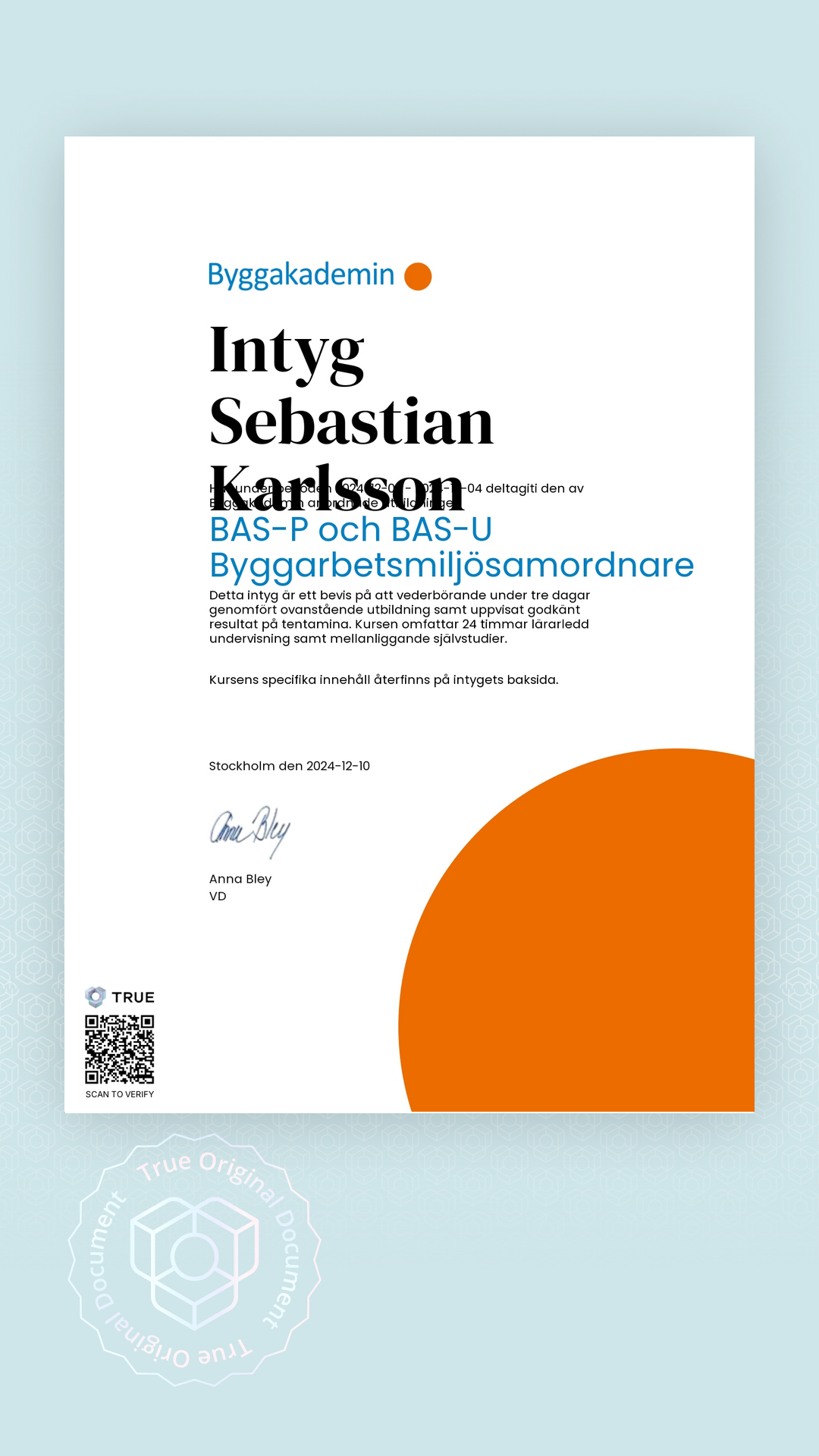 Alla TRUE -document är säkrade med blockchain-teknologi och kan verifieras som äkta. Klicka på verifieringsknappen bredvid dokumentet eller skanna QR-koden med din smartphones kamera. Ingen app krävs - dokumentets äkthet verifieras omedelbart.